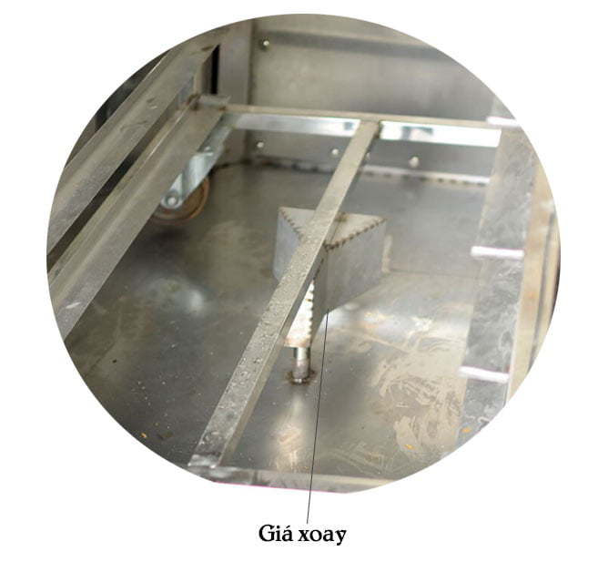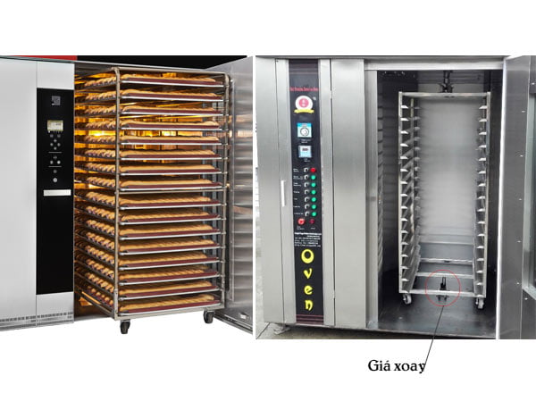 Loại thiết bị này bên trong được tích hợp thêm hệ thống trục xoay và bánh xe. Trên trục xoay có chứa các khay để chứa bánh. Sau khi bột đã được ủ và nở, bạn xếp bánh vào khay và bỏ vào lò, cài đặt nhiệt độ thích hợp và thời gian. Giá xoay trong quá trình nướng sẽ giúp bánh chín đều. Ưu điểm của loại thiết bị này là tiết kiệm thời gian và sức lao động.