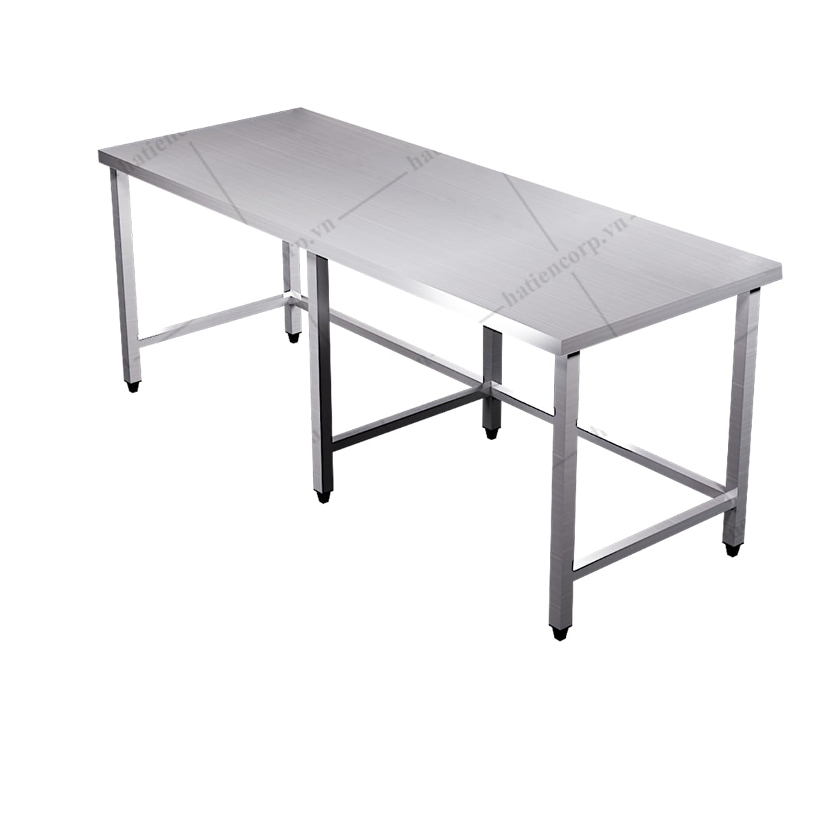 Bàn inox chữ nhật dài Hà Tiên làm tăng thêm không gian chứa đựng dụng cụ nhà bếp. Giúp khu vực chế biến món ăn, trưng bày, soạn chia thức ăn được rộng rãi hơn. Bàn được sản xuất từ chất liệu inox 304 nhập khẩu từ hãng Hyundai, Posco của Hàn Quốc. Do đó, đảm bảo được các yêu cầu chất lượng, độ bền cao, chống rỉ sét tốt. Bàn inox công nghiệp của công ty Hà Tiên được các kỹ sư tính toán thiết kế kỹ lưỡng kết cấu nên luôn đảm bảo chịu lực rất tốt. Đặc biệt bàn được thiết kế đảm bảo an toàn vệ sinh thực phẩm trong điều kiện nhiệt độ cao, độ ẩm nhiều, thường xuyên tiếp xúc với dầu mỡ, muối, các gia vị khác…