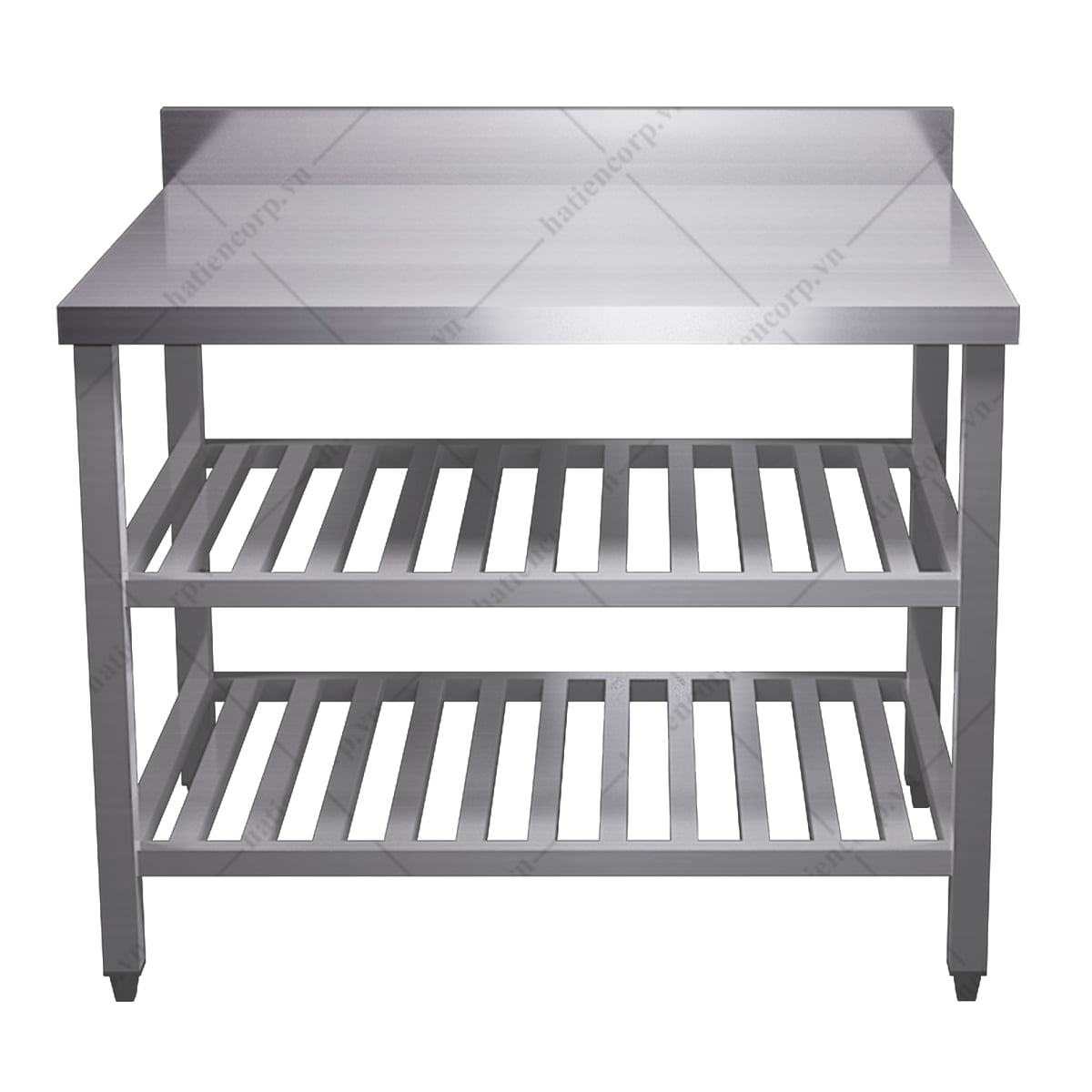 Bàn inox 3 tầng 400x600x850/950mm kệ thanh có thành. Thường đặt sát tường tại khu vực tiếp nhận và sơ chế nguyên vật liệu. Được thiết kế thêm 2 kệ thanh phía dưới giúp tận dụng không gian. Kệ thanh tạo bề mặt thông thoáng, dễ dàng thoát nước, giúp vật dụng luôn khô ráo và sạch sẽ. Thành cao nhằm giúp ngăn nước và chất bẩn bắn ra phía sau. Bàn được sản xuất từ chất liệu inox 304 nhập khẩu từ hãng Hyundai, Posco của Hàn Quốc. Do đó, đảm bảo được các yêu cầu chất lượng, độ bền cao, chống rỉ sét tốt. Bàn inox 304 của công ty Hà Tiên được các kỹ sư tính toán thiết kế kỹ lưỡng kết cấu nên luôn đảm bảo chịu lực tốt. Đặc biệt được thiết kế đảm bảo an toàn vệ sinh thực phẩm trong điều kiện nhiệt độ cao, độ ẩm nhiều, thường xuyên tiếp xúc với dầu mỡ, muối, các gia vị khác…