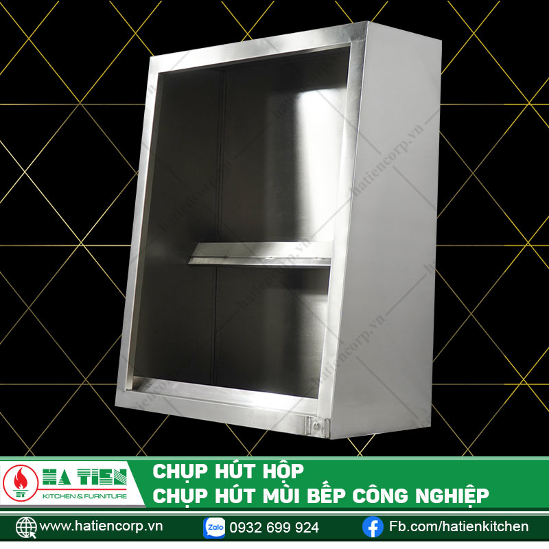 Chụp hút mùi bếp công nghiệp – chụp húp hộp do Hà Tiên thiết kế và sản xuất. Đây là sản phẩm không có phin lọc mỡ. Thường dùng cho các loại máy rửa chén công nghiệp.