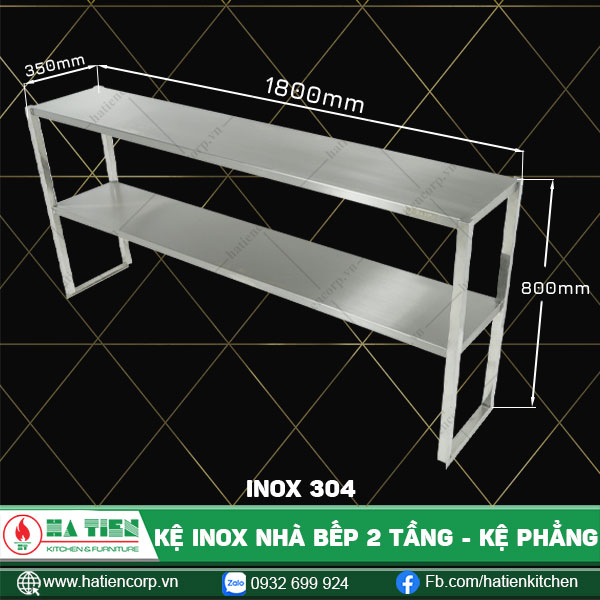 Kệ inox nhà bếp 2 tầng đặt trên bàn do Hà Tiên sản xuất: Làm tăng thêm không gian chứa đựng dụng cụ phòng bếp với thiết kế 2 tầng. Dễ dàng sắp xếp, hạn chế di chuyển giúp thao tác làm bếp trở nên nhanh chóng với các vật dụng ngay trong tầm tay.