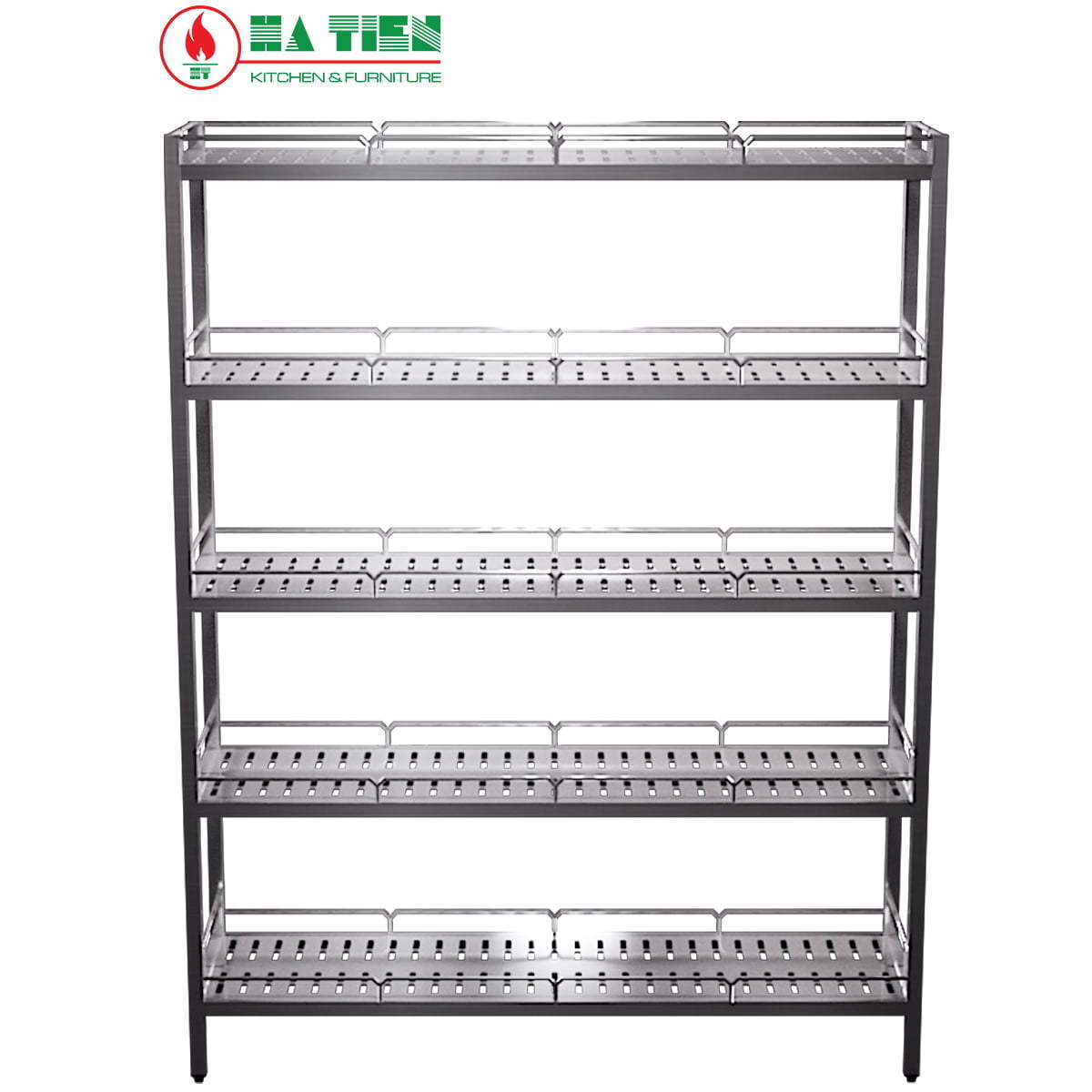 Kệ inox 5 tầng 1200x300mm, kệ đột lỗ, có lan can – Kệ inox 304 chất lượng tốt để mở rộng thêm không gian lưu trữ đa năng cho nhà bếp công nghiệp của bạn.