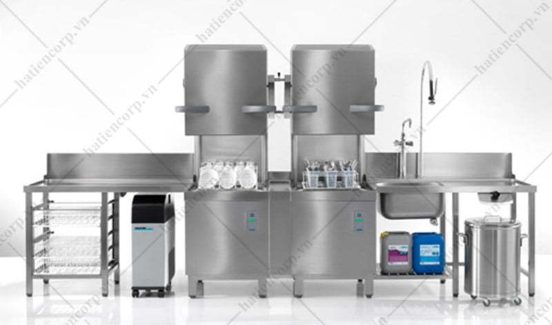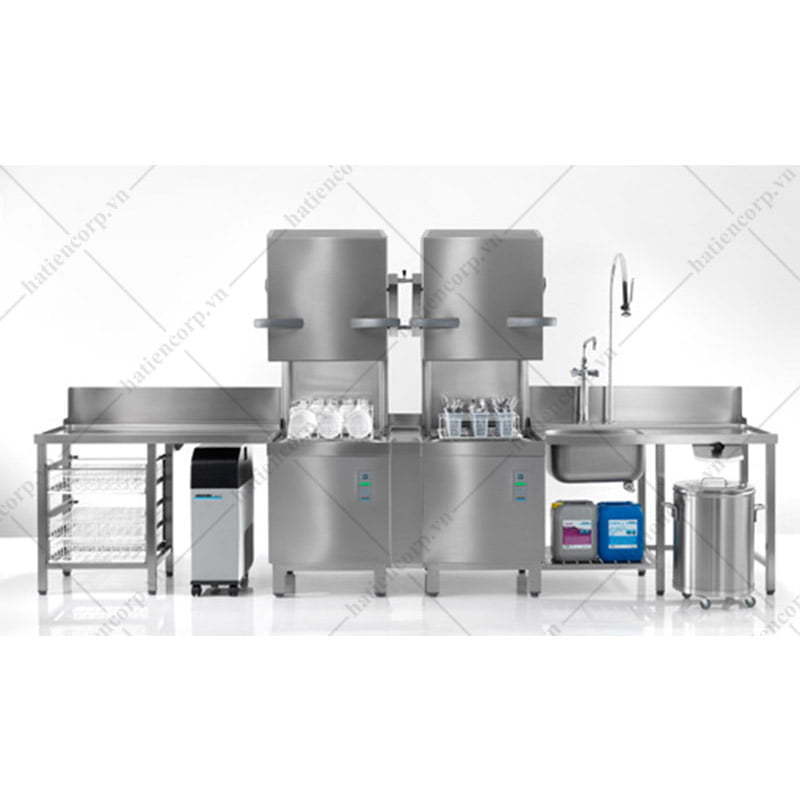Có thể sử dụng kết hợp hệ quầy đôi 2 máy rửa chén công nghiệp.