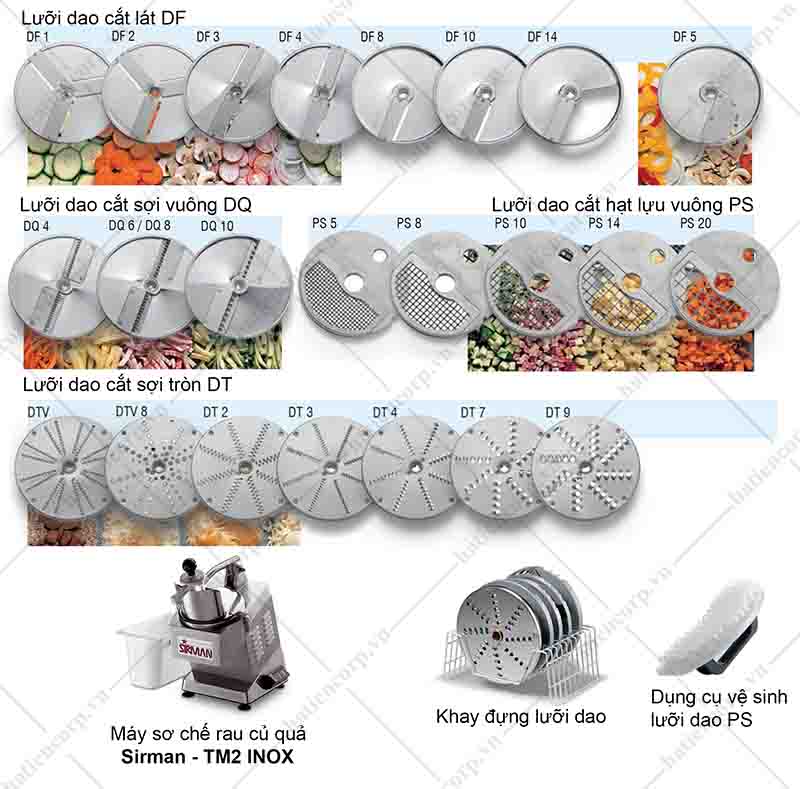 Máy sơ chế Sirman – TM2 INOX được thiết kế đa năng với rất nhiều công dụng. Rau củ được sơ chế thành nhiều hình dáng khac nhau tùy thuộc vào loại lưỡi dao. Có 4 dòng lưỡi dao chính: