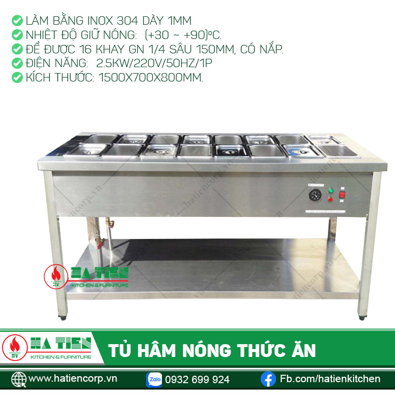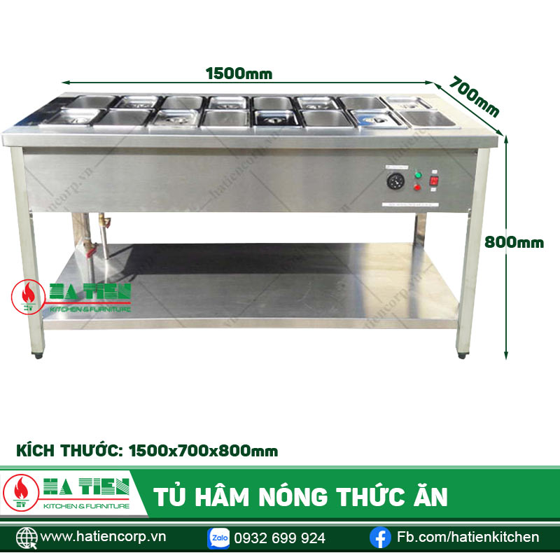Tủ hâm nóng thức ăn Hà Tiên có kích thước: 1500x700x800/900mm.