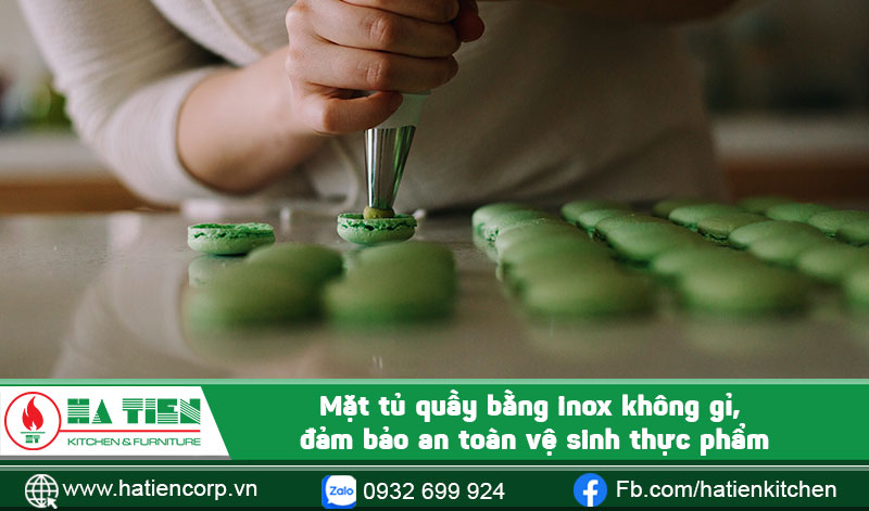 Đặc biệt, chất liệu inox cao cấp đảm bảo an toàn vệ sinh thực phẩm. Vì vậy mặt quầy có thể dùng cho việc chuẩn bị thực phẩm, sơ chế, tẩm ướp nguyên liệu hoặc dùng làm nơi tạo hình nguyên liệu, nhào nặn bột để chuẩn bị đưa vào lò nướng bánh.