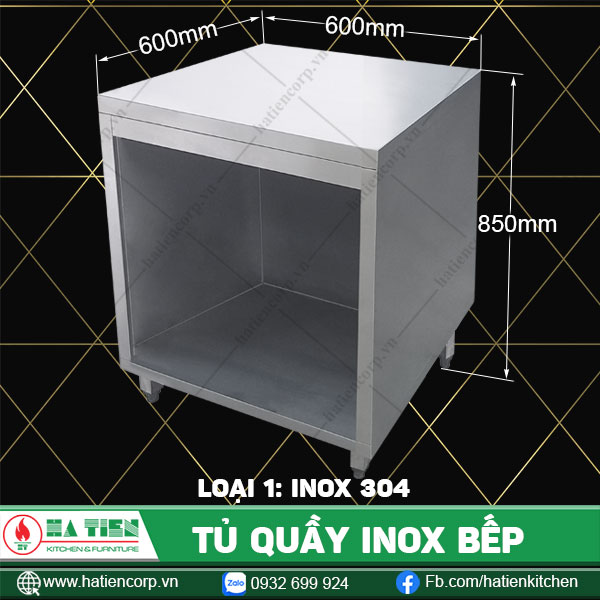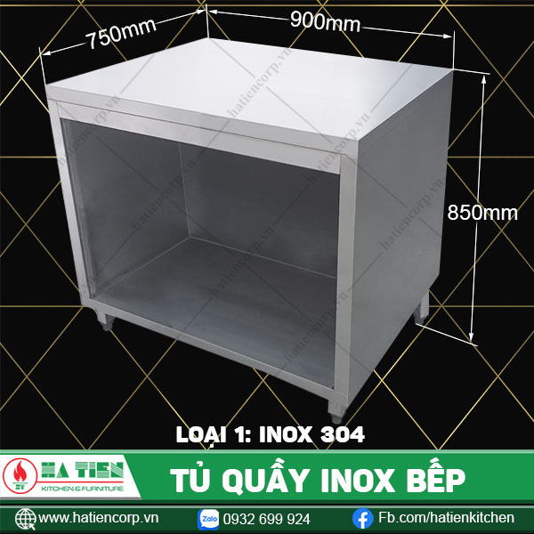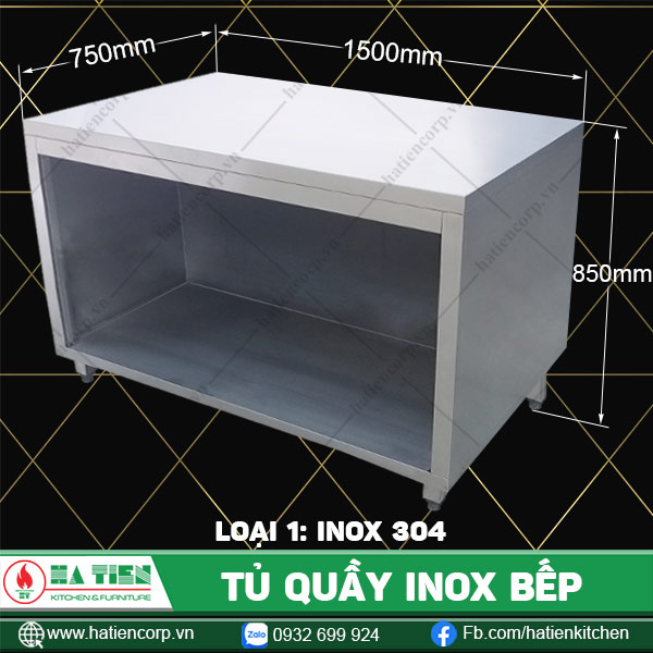 | Kích thước quầy inox (mm) | 1200×600, 1200×750, 1500×600, 1500×750, 1800×600, 1800×750, 2100×600, 2100×750, 600×600, 600×750, 900×600, 900×750 |