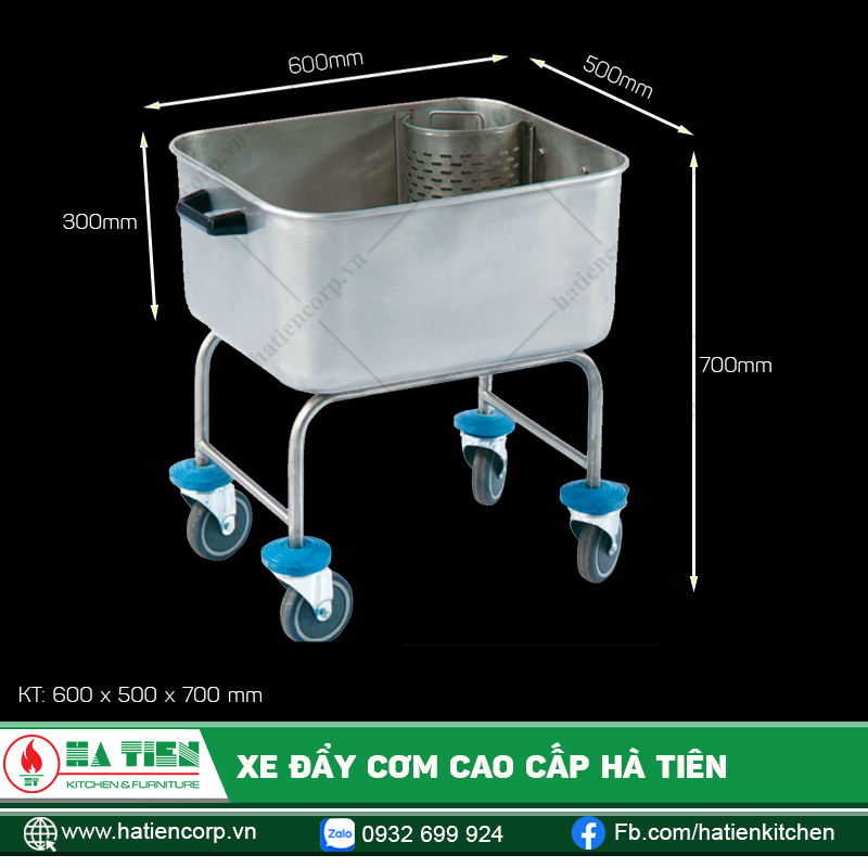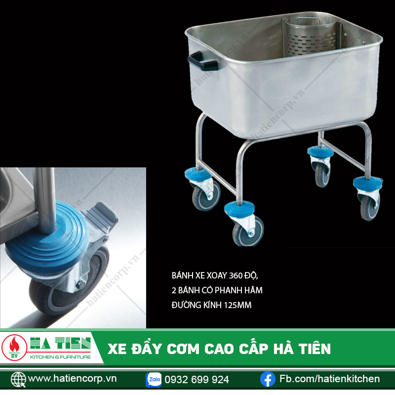 Trang bị 4 bánh xe giúp việc di chuyển được nhẹ nhàng, không tốn sức. Xe được sử dụng tại các bếp ăn công nghiệp, bếp nhà hàng…