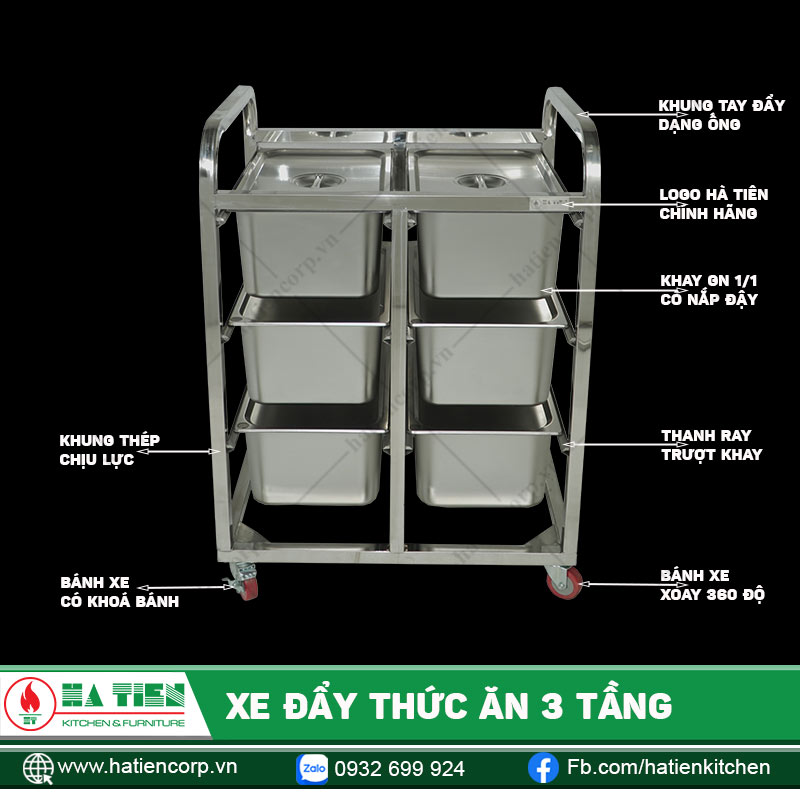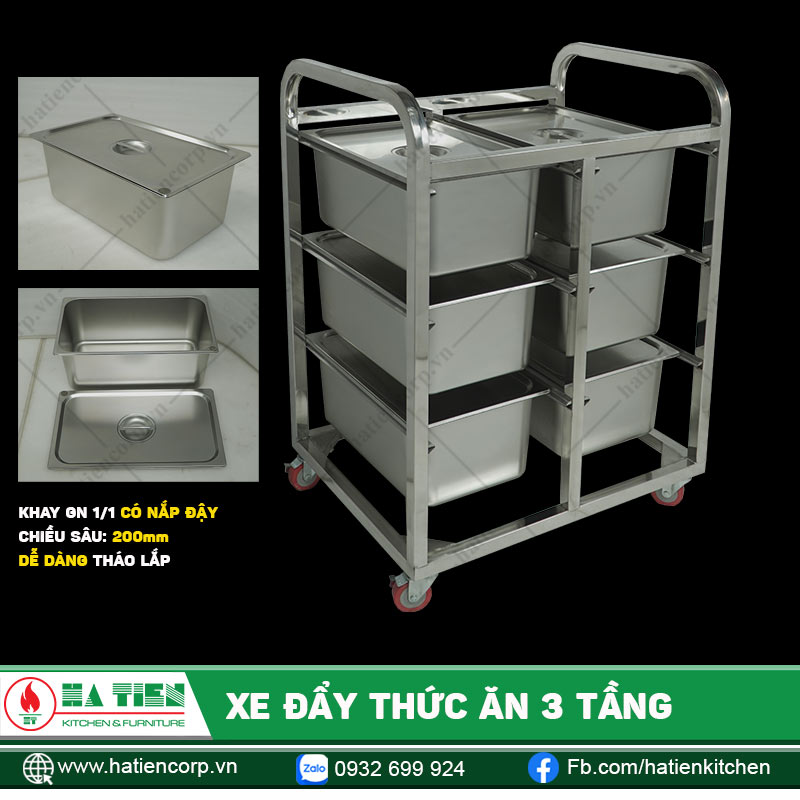 Xe đẩy thức ăn 3 tầng Hà Tiên được sản xuất bằng 100% inox cao cấp, không nhiễm từ tính, an toàn thực phẩm. Xe đẩy thực phẩm, đồ ăn phục vụ khách với các khay GN giữ nóng có nắp đậy. Đây là thiết bị hữu ích phục vụ tại các nhà hàng, quán ăn, bếp công nghiệp.